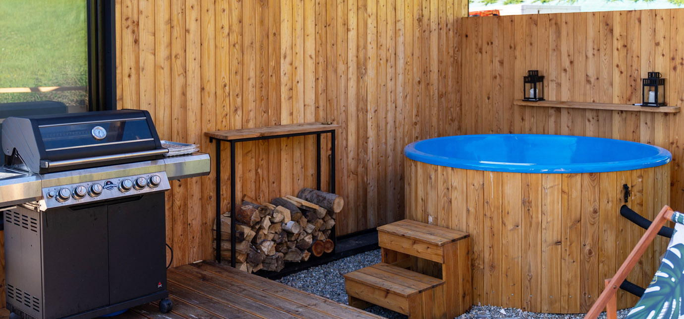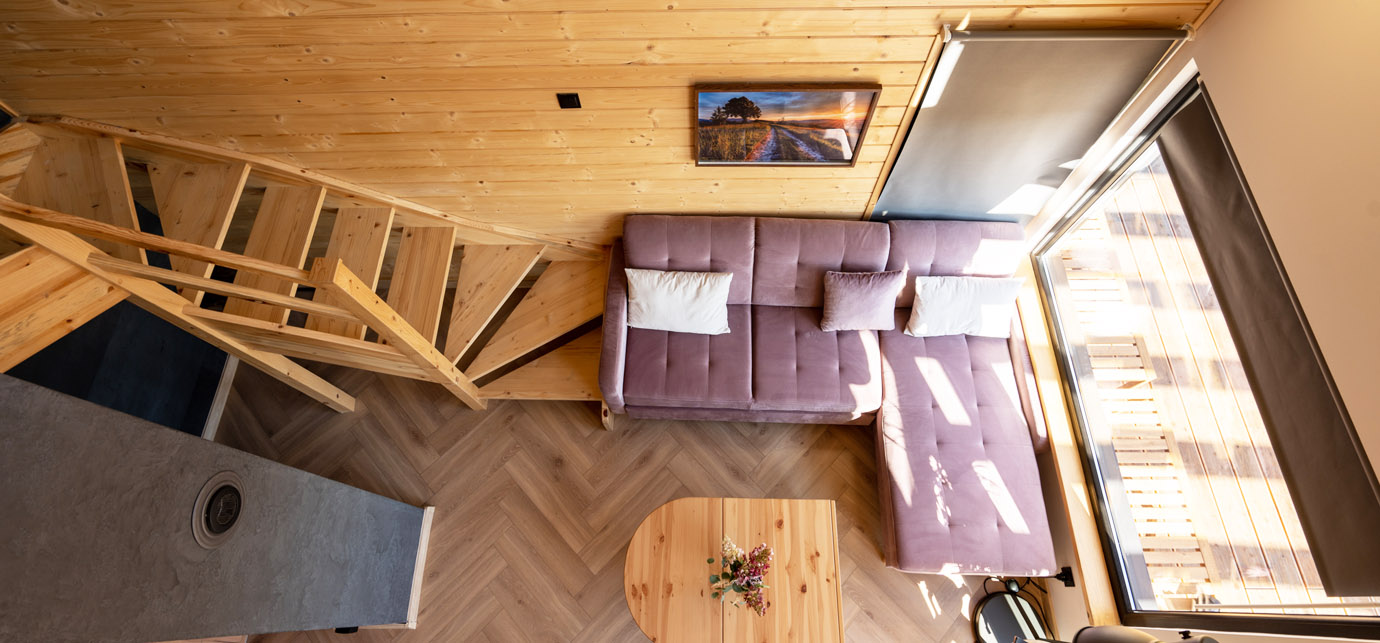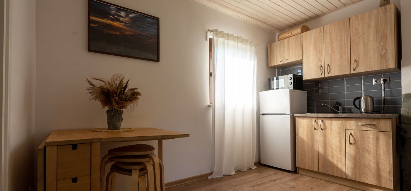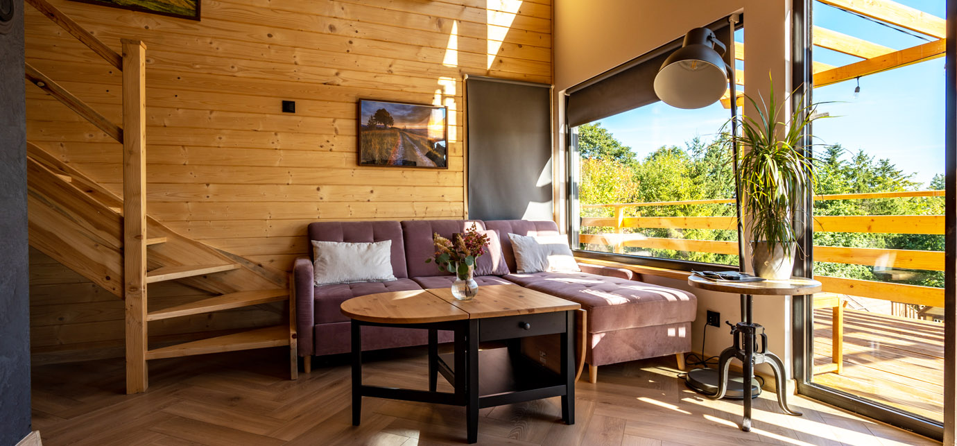 Każdy domek jest w pełni wyposażony, oferując przytulne wnętrza z nowoczesnymi udogodnieniami, zapewniając relaksujący pobyt niezależnie od pory roku.
